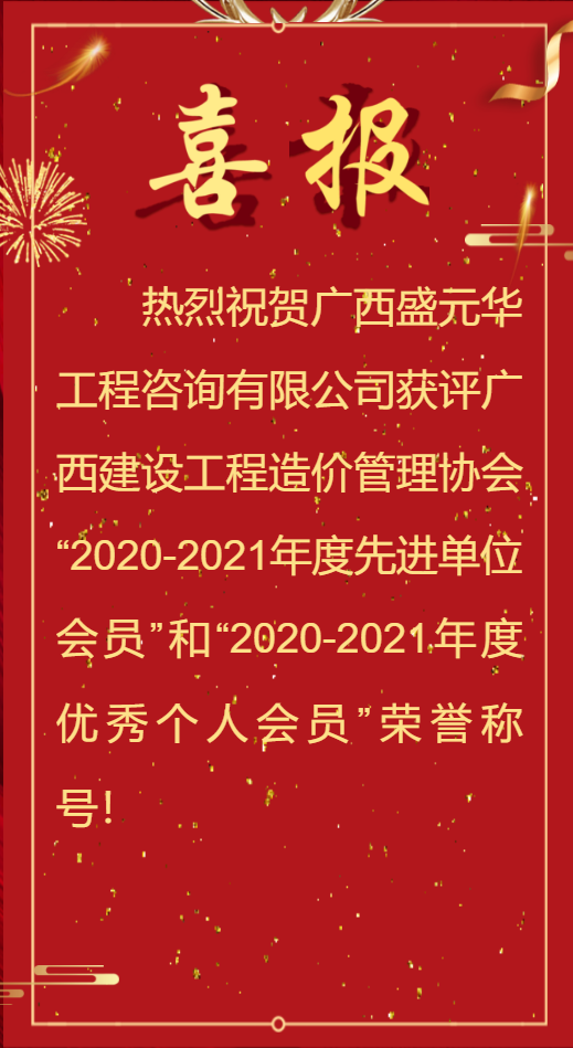 | 【喜訊】熱烈祝賀廣西盛元華獲評廣西建設(shè)工程造價(jià)管理協(xié)會“2020-2021年度先進(jìn)單位會員、優(yōu)秀個(gè)人會員”兩項(xiàng)榮譽(yù)稱號 |