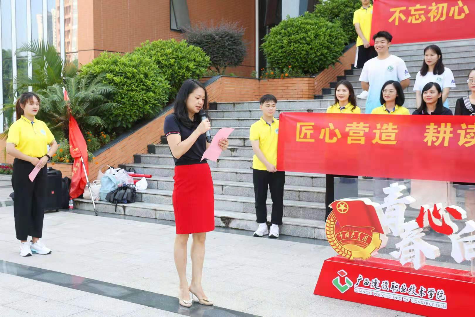 出征儀式合影 廣西建設(shè)工程造價管理協(xié)會黨支部書記王燕蓉在出征儀式上講話。她說,新時代青年既是實現(xiàn)第一個百年奮斗目標(biāo)的經(jīng)歷者、見證者,更是實現(xiàn)第二個百年奮斗目標(biāo),建設(shè)社會主義現(xiàn)代化國家的生力軍。對此,她希望同學(xué)們能夠通過此次“科技、文化、衛(wèi)生”三下鄉(xiāng)活動,深入了解我國鄉(xiāng)村振興戰(zhàn)略,并通過實踐把服務(wù)的熱情和學(xué)到的知識運(yùn)用到新農(nóng)村的建設(shè)中。