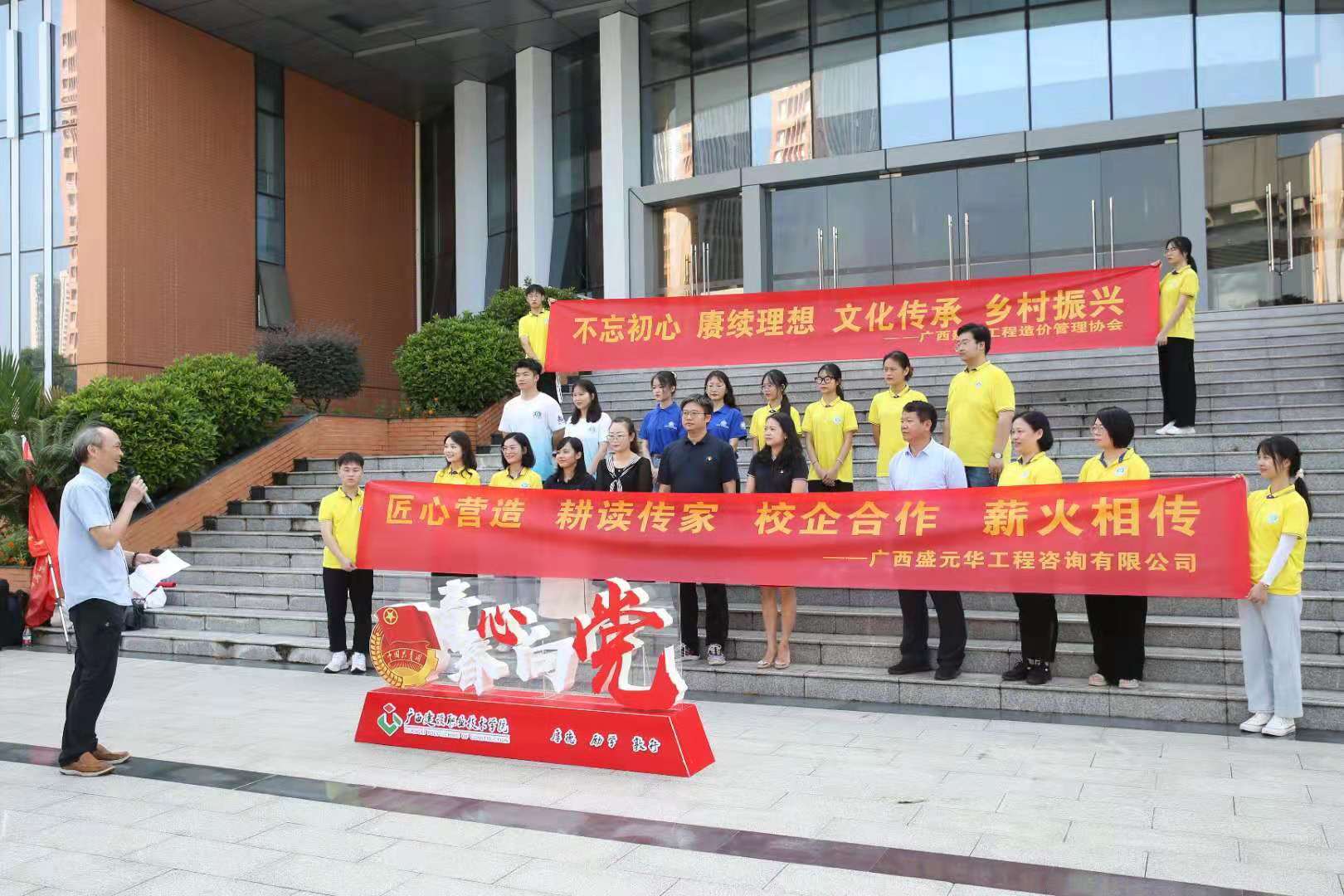 黃藝副總經(jīng)理在出征儀式上講話 據(jù)悉,我公司去年與廣西建設(shè)職業(yè)技術(shù)學(xué)院校企合作的“三下鄉(xiāng)”社會實踐活動收到了良好的社會效果。再次出征啟程,依托學(xué)?!叭恕笔痉断灯脚_,“雙高”院校建設(shè)工程管理專業(yè)群建設(shè),融合互聯(lián)網(wǎng)+項目打造,由廣西建設(shè)職業(yè)技術(shù)學(xué)院管理工程系、馬克思主義學(xué)院聯(lián)手組織,得到我公司與廣西建設(shè)工程造價管理協(xié)會全程指導(dǎo),既加強(qiáng)了校企合作聯(lián)系,又體現(xiàn)了行業(yè)企業(yè)的社會擔(dān)當(dāng),更借助實踐檢驗育人實效,實現(xiàn)了學(xué)校、行業(yè)、企業(yè)“三線交融”,匯聚校行企力量,助力鄉(xiāng)村振興。