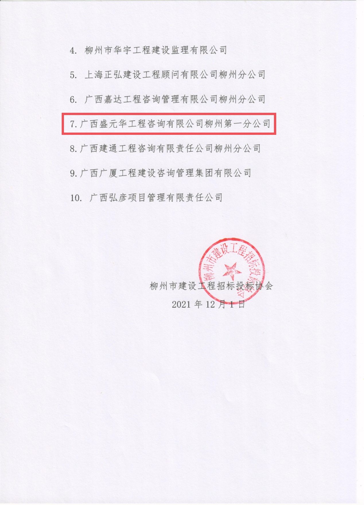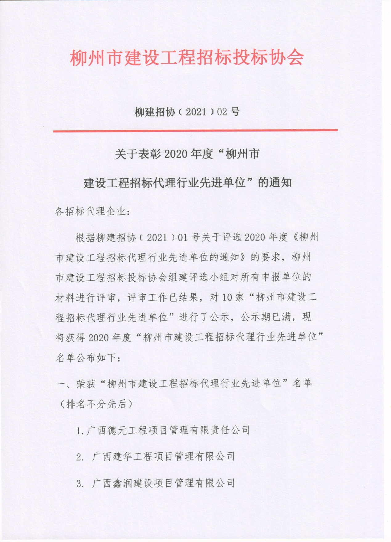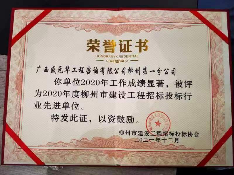 | 喜訊!熱烈祝賀廣西盛元華集團(tuán)旗下柳州一分公司榮獲2020年度"柳州市建設(shè)工程招標(biāo)代理行業(yè)先進(jìn)單位"的榮譽(yù)稱號(hào) |